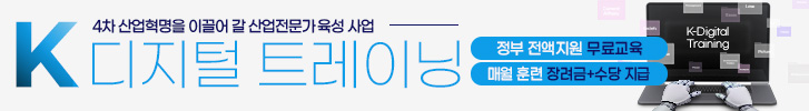 본 과정은 K-디지털 트레이닝 훈련 과정으로 (이하 K-디지털 훈련) K-디지털 훈련이란 AI, 빅데이터 등 디지털·신기술 분야에서 다양하게 활용되는 기반기술, 그리고 이를 활용한 핀테크, 스마트제조 등의 응용기술을 배울 수 있도록 다양한 훈련과정을 제공하는 직업훈련 과정입니다. 본 원에서의 모든 K-디지털 훈련 과정은 수강료 및 교재비에 대해 전액 무료로 수강하실 수 있으며, 월 최대 816,000원(매월 훈련장려금+특별훈련수당 추가)을 지원해 드립니다.